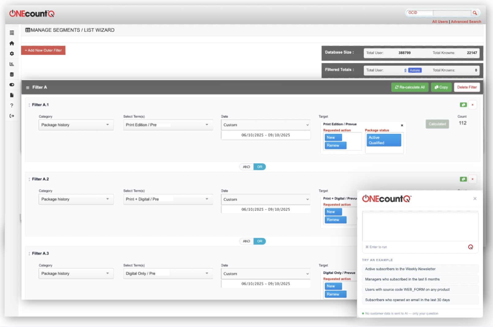 ONEcount Q allows publishers and media companies to query, filter, and segment their subscriber and audience data simply by typing — or speaking — a plain-English question, with no knowledge of query syntax, database structures, or filter logic required.